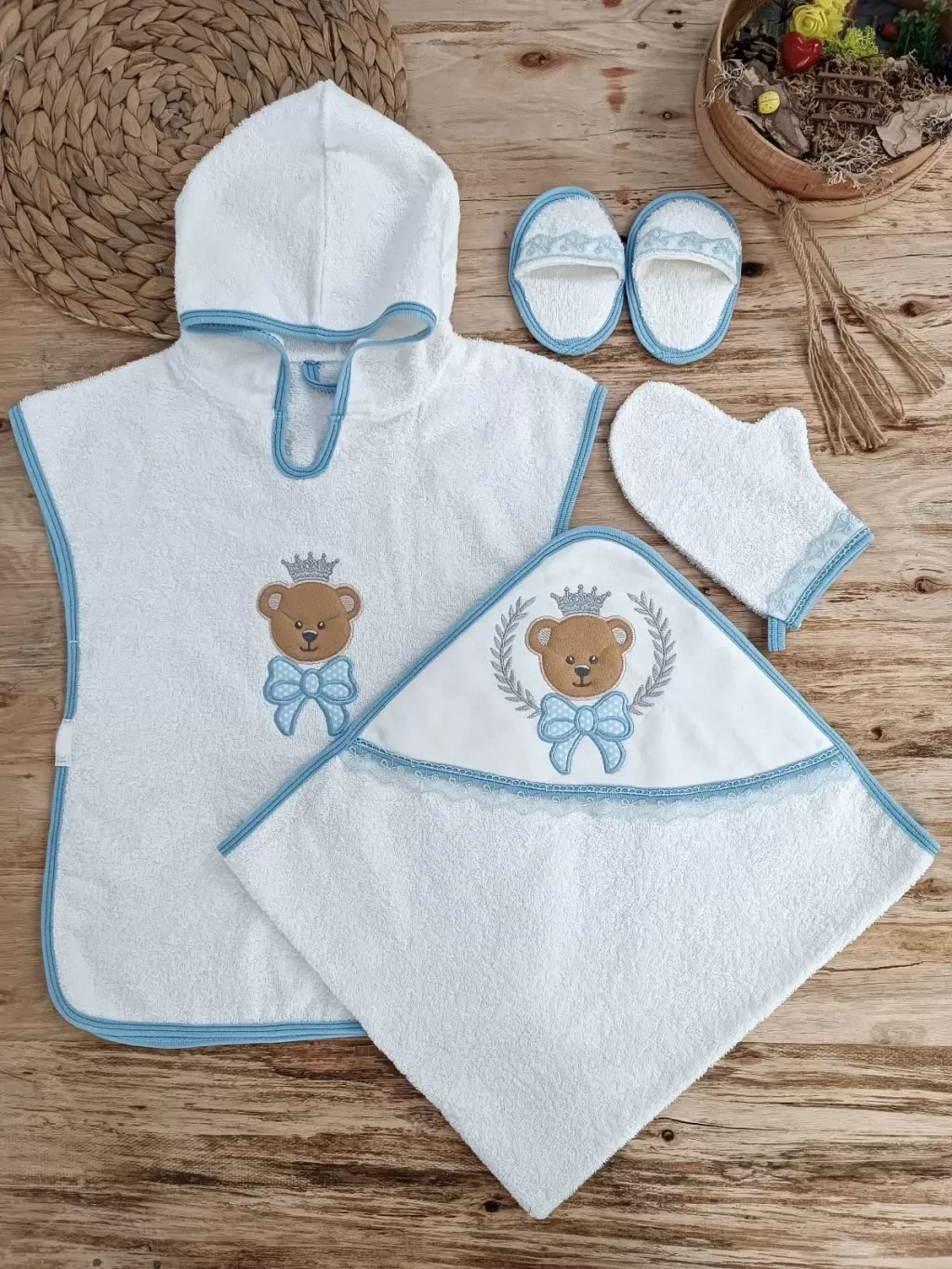 0-6 Ay Kaplan Nakışlı Bornozlu 5li Erkek Bebek Havlu Silgi Takımı Mavi